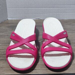 Crocs Low Wedge Slides Size 10 pink white Strappy Slip On Summer Comfort Sandals