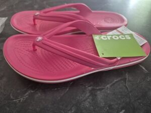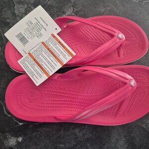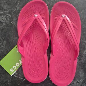 Classic Crocs flip flops in a vibrant hot pink color. This style/color is retired and no longer sold in stores, making them a rare find for Crocs lovers. Known for their cushioned comfort, lightweight feel, and water-friendly design, these sandals are perfect for the beach, pool, or everyday wear.