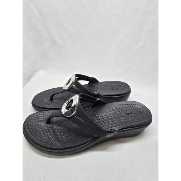 Crocs Sanrah Hammered Metal Circle Wedge Thong Black Silver Sandals Women's 8