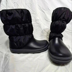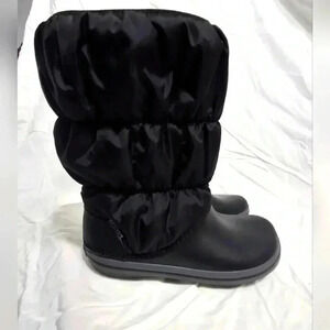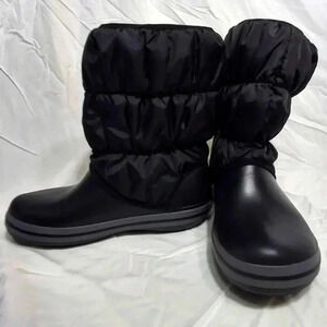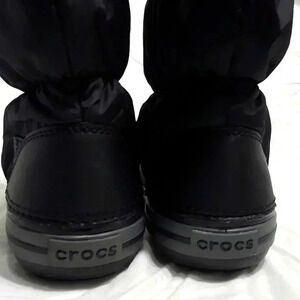 Crocs winter boots, black with gray trim, warm fleece liner. women's size 7 us. size 37. worn once. excellent new condition.