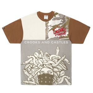BRAND NEW in bag Crooks Mili Ovs Medusa Tee. This dope cut-and-sewn tee features an extra-large Medusa print design and camo paneling with Crooks logo. The hems are double stitched and the material is a suuuuuuuper comfy pre-shrunk combed cotton - making it a truly unique QUALITY piece.