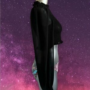 Elasticized front and back panels, back zipper closure, long balloon sleeves with ruffle accents.