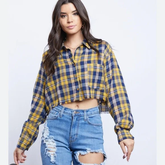 Faded Rose Cropped flannel in size XL yellow and black. With chest pocket and raw edge bottom. Stock photo for fit reference. Approximately 24” pit to pit