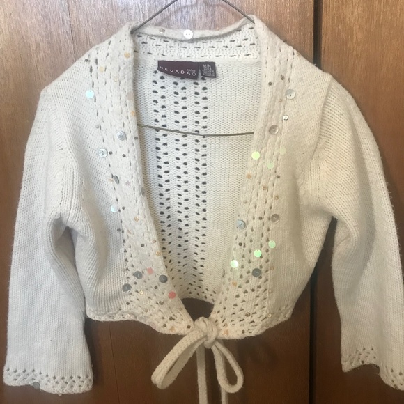 Cream crop knit cardigan/shrug with front tie and sequin detail.