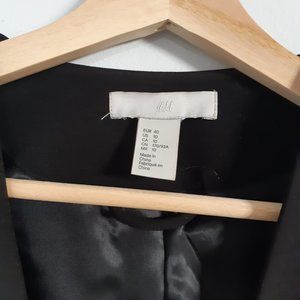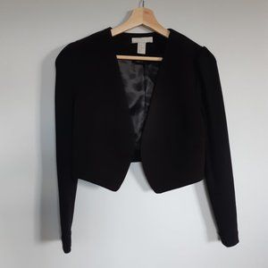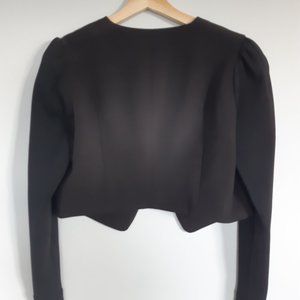 A cropped jacket with long sleeves, great for more formal occasions. Collarless, open/no buttons, front panels come to a slight point, lands just at the waist. The long sleeves are gathered at shoulders and made of a ribbed elastic material, really stretchy. The body is a more structured, lined suiting fabric. Excellent condition.