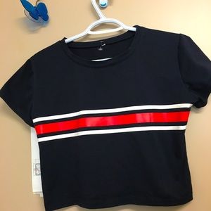 Navy blue/ almost black quite short crop top with red. Stripe. Totally looks like a Calvin Klein Lookalike.