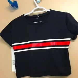 Navy blue/ almost black quite short crop top with red. Stripe. Totally looks like a Calvin Klein Lookalike. Brand new tag just fell off.