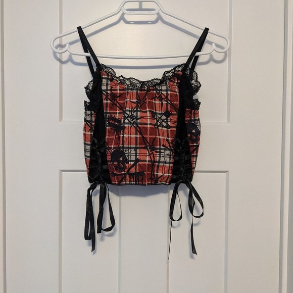Black lace skull tartan crop top. Adjustable lace up sides. This says it's a small but it fits size XS too. New without tags.