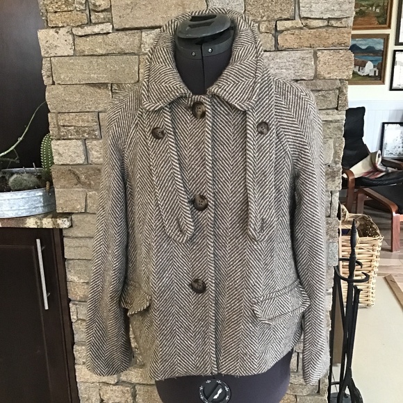Liz Claiborne Petite cropped wool jacket with herringbone pattern. Fully lined. Three large buttons. Collar that can be turned up or made to lay flat. Two front packets with flaps. Decorative belt. Size M.