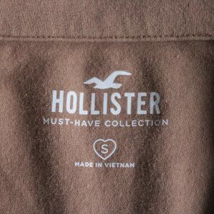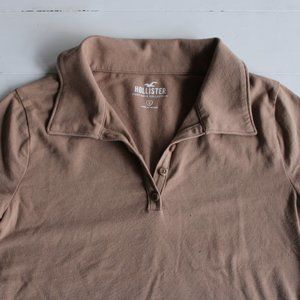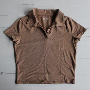 From Hollister, a cropped short sleeve polo shirt in light brown. Soft fabric with button front and collar detail. Preppy and cute with denim shorts or as a layering piece under crewnecks.