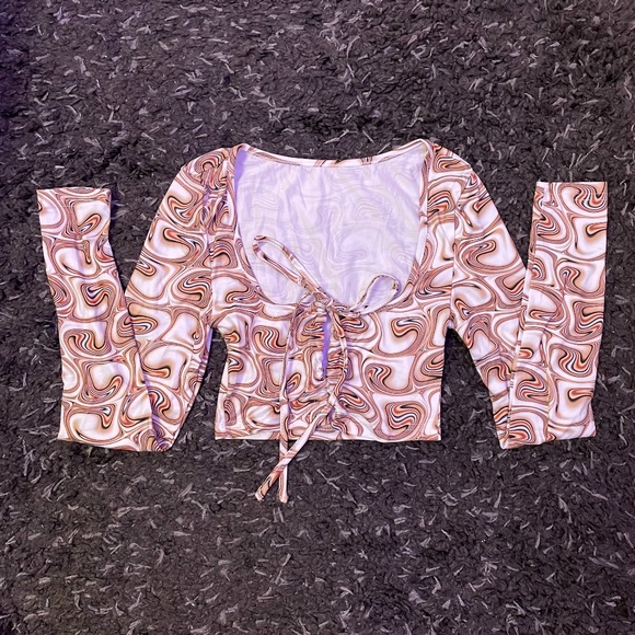 Cropped Marble Print Ruched Front Long Sleeve Top