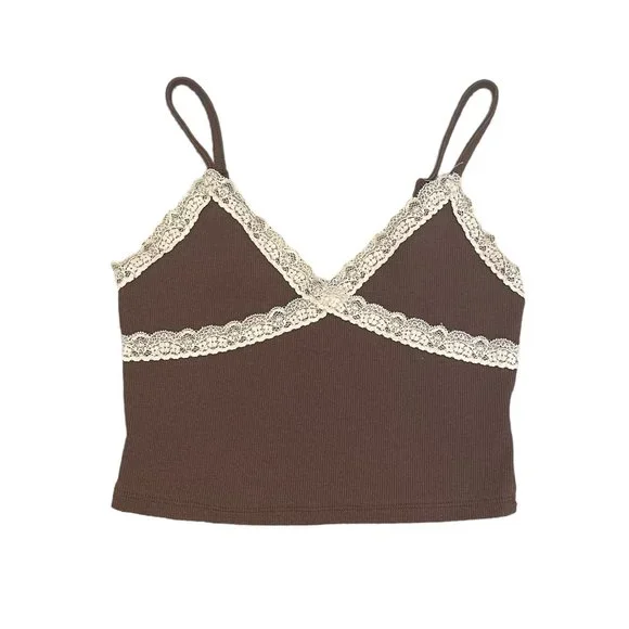 Ribbed cropped brown tank top with lace detail.