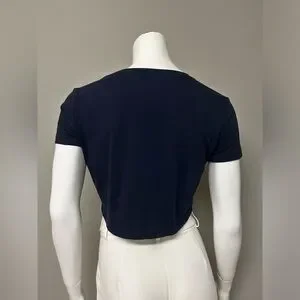 This is a loose-fitting, comfortable, and cropped t-shirt. It pairs nicely with a matching fitted tank top underneath, or just by itself.