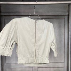 Criss-crossed in the front, cropped top with lots of detail including a zipper in the back and elastic around the sleeves. Too white to be green and too green to be white. Minty with a retro-vibe.