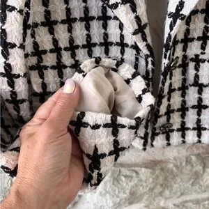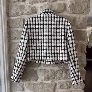 A blazer constructed of multicolored plaid tweed and accented with glamorous buttons.