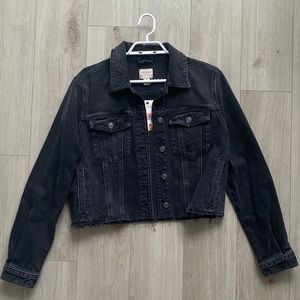 Super cute and flattering. Writing detail at back. Raw hem bottom. Charcoal black, nice twist on typical denim jacket. Super versatile. Perfect for fall 🍁🍂.