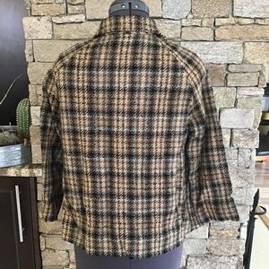Handmade 1960’s cropped jacket with 3/4 length sleeves. Lovely brown wool plaid with pale green running through it. Complementary grey/green lining. Four brass like buttons and two pockets in the front. Delicate collar that can be turned up or laid flat.