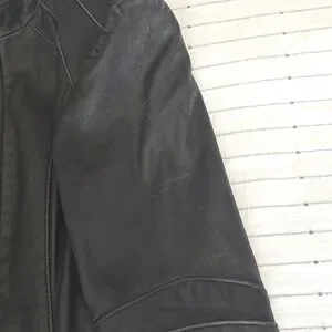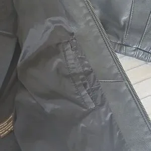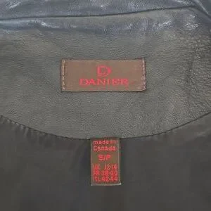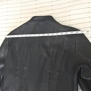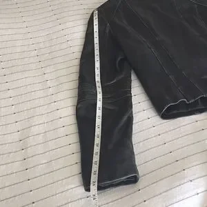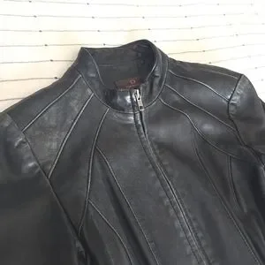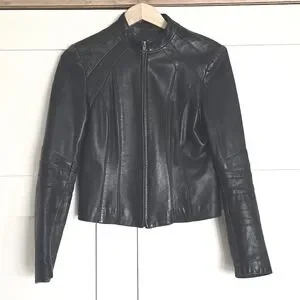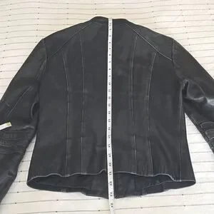 This incredibly soft, lambs leather motorcycle jacket from Danier features a zipper closure, round collarless neckline and moto detailing at shoulders and elbows. A sleek exterior with no pockets or embellishments, one interior slip pocket. Fully lined. Size small - jacket photographed with measuring tape to help with sizing. Stretch lining.