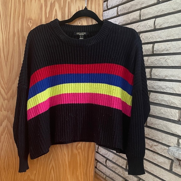Black cropped sweater with red, blue, yellow, green and pink stripes. Bought at urban planet circa 2017. Size small but oversized fit, can fit up to a large.