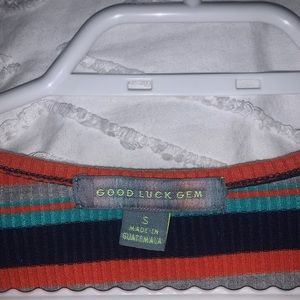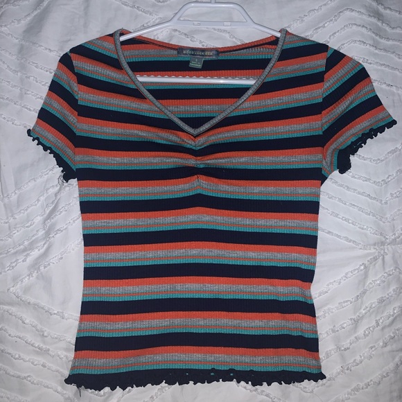 New stripped multicoloured t-shirt. Cropped with ruche pattern on the top middle of the shirt