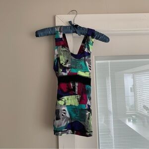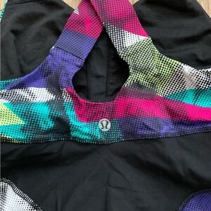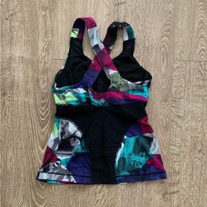 Brand new condition, no pilling. Lululemon cross back tank with black mesh detailing and built in shelf bra. Option to add cups to the bra but does not come with cups. Beautiful and rare retro style coloured pattern! Size 2