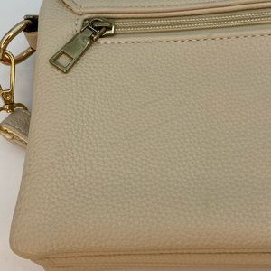 Casual cross body with lots of storage space and pockets in interior, expandable bottom. Button clasp closure. 2 straps included one short, one long.