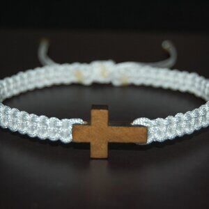 Cross Bracelet,Wood Cross Bracelet,Braided Bracelet,White Bracelet