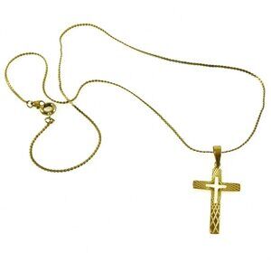 Cross measures approx 3/4" x 1 1/4". Chain necklace is 16" long. Unknown metal.