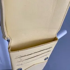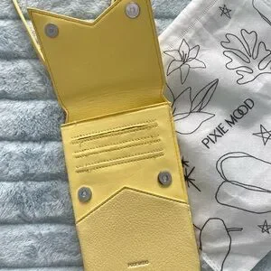 Pixie Mood soft butter yellow crossbody bag, pebble leather-look composition; 7.5” tall and .75” deep, holds cell phones perfectly. Has three card slots in front and a full length slot in the back. Strap is adjustable with buckle and can be clipped off. Perfect for spring and summer, and special occasions. Used once for a wedding.