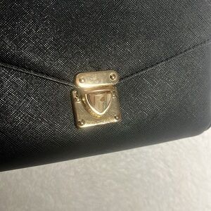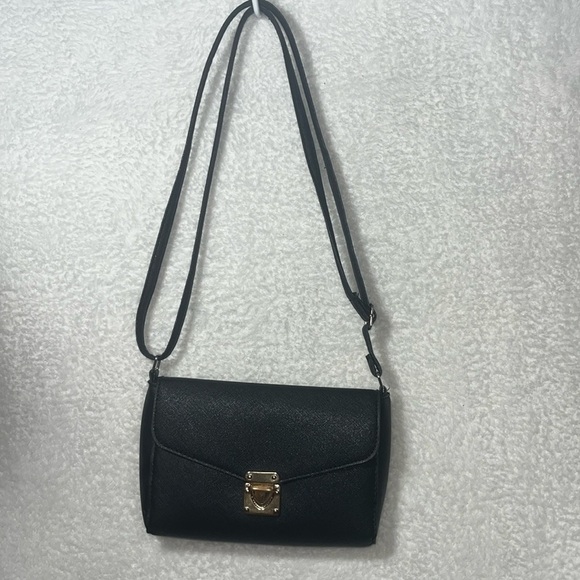 This stylish Ardene crossbody bag is perfect for everyday use or a night out. It features a sleek black design with a gold-tone hardware. The bag has a main compartment and a smaller interior pocket.
