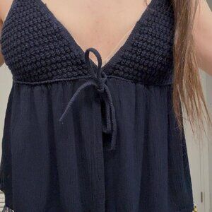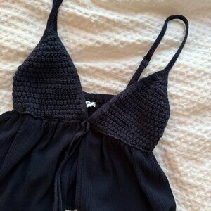 black crochet, tie-front, open back, casual tank, minimalistic, summer top, lightweight, boho style, distressed, versatile