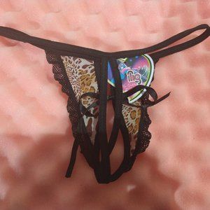 Leopard print. The front is open but is tied together with a lace. It does not have a size but it seems like a size small and it stretches quite a bit.