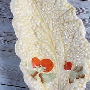 Vintage Crown Devon leaf-shaped candy dish in pale yellow with orange fruit image and textured finish. Good condition with one small chip on the top edge and some crazing (see photo). Measures 11.5" long including handle, 4.75" wide, and 1.25" deep. Perfect for serving candy, veggies, nuts, or holding trinkets.