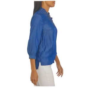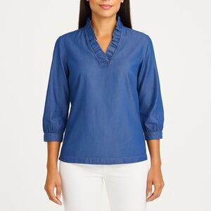 Lightweight chambray blouse with a ruffle neckline and 3/4 sleeves. Pull-on style with an easy, relaxed fit—perfect for warm weather, layering, and everyday wear.