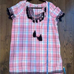Crown & Ivy Dress Sz 14 Pink Blue White Plaid Tassel Short Sleeve Beach Casual