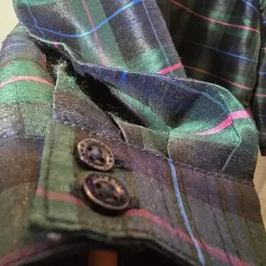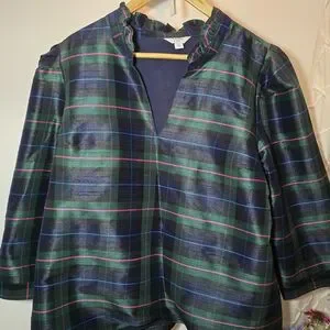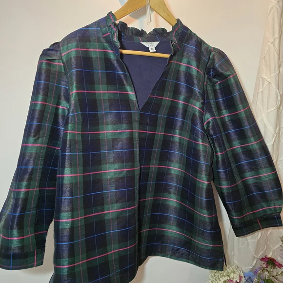Modern fit blouse with ruffle detail and. Features a blend of dark green, blue, and pink hues in plaid with a slight sheen. Made in India. Perfect unique piece for biz casual or formal attire. Pairs beautifully with jeans or dress pants. High-quality ruffle detailing and stitching, with a polyester shell and soft supple lining. Comfortable, modern, and chic in like new condition.