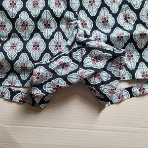Crown & Ivy petite shorts. Dark blue with a white, blue, and red abstract floral print. Mid rise. 2 buttons and a zipper. Belt loops. The waist and back pockets are still stitched closed. Marked a size 12P. 98% cotton and 2% spandex. There are not any stains, tears, or holes. Very good, gently used condition.