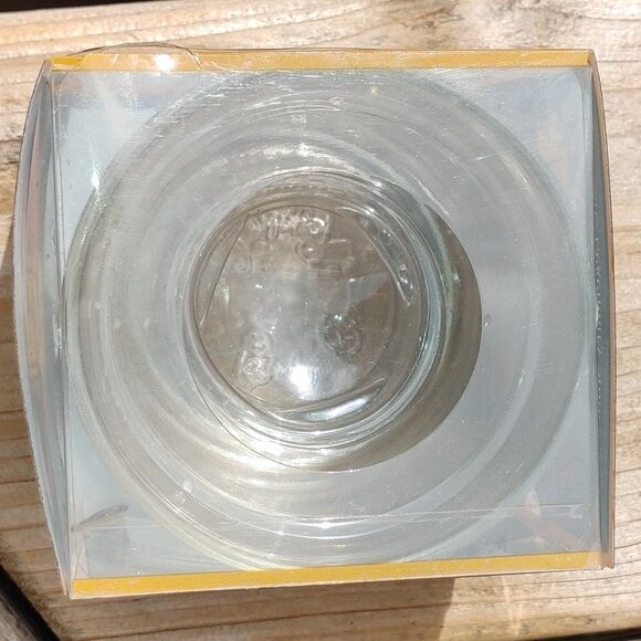 Very weighty glass with frosted logo in the front and the bottle cap in the bottom.