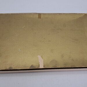 A vintage -likely 1970s- knife set made by Crown Sheffield in England in their Woodlyn line. It is in its original box which includes a little recipe book in both English and French. It has 4 knives instead of the original 5 (it is missing a paring knife). The 4 knives are a carving knife, a frozen food knife, a cheese knife and a utility knife. The box is 15 1/8" by 9 7/8".
