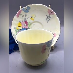 Crown Staffordshire Teacup & Saucer Pale Yellow w/Blue, Pink, and Yellow Flowers
