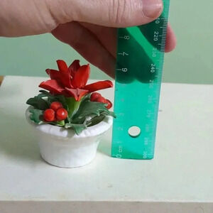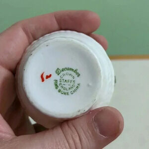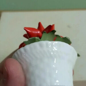 Crown Staffs England Fine Bone China December Poinsettia Pot. Small 4 oz. arrangement called DECEMBER. It has holly leaves and berries and a large poinsettia flower in the middle, sitting in a white basket. The markings on the bottom read, “December, Crown STAFFS, ENGLAND, and Fine Bone China”. This measures 1 ¾” across the bottom of the pot and approximately 2 ½” across the top. It is very delicate and pretty, perfect little addition to a Christmas table arrangement. Some leaf tips are missing. This was given to our Mother in the 1970's.