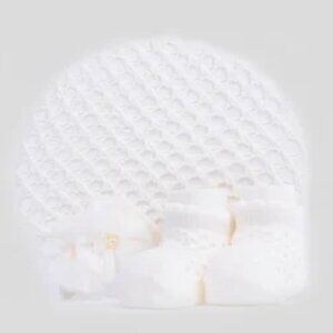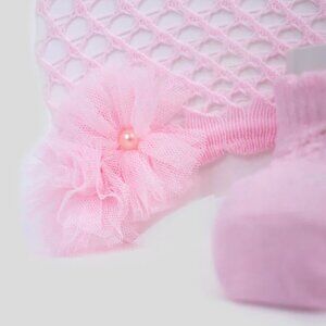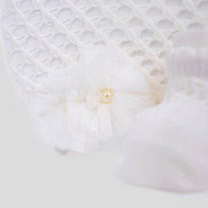 This adorable set, made from the finest Turkish cotton yarn, is designed for babies aged 0-6 months. It includes a beautifully crocheted hat and matching socks, providing both style and comfort. The breathable crochet design ensures your baby stays intact in comfort, making it perfect for year-round use. Both the hat and booties are adorned with delicate tulle flowers, adding an elegant and charming touch to your baby’s outfit, which is ideal for special occasions, photoshoots, or everyday wear. The soft Turkish cotton yarn ensures the set is gentle on your baby’s sensitive skin, while the matching booties offer warmth and a snug, secure fit for those tiny toes. This beautifully crafted set is a wonderful gift for any newborn.