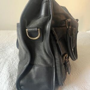 In mint condition, beautifully designed and crafted canvas and leather tote from Crowncap (100% Canadian). Cotton interior blue/beige plaid big enough to fit a 15” laptop.