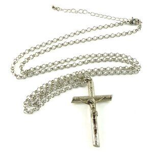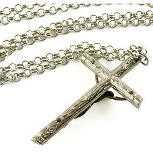 Cross measures approx 1 1/2" x 2 1/4". Chain necklace is 32" long + 3" extender chain. Unknown metal.