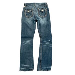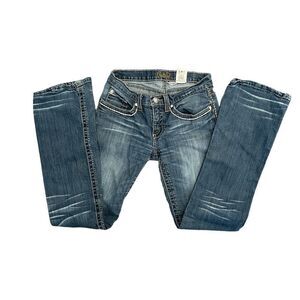 Cruel Girl Lindsay Bootcut Jeans Low Rise Medium Blue Denim Juniors 5R. Factory whiskering. Very good used condition. Please see photos for approximate measurements.