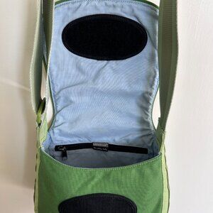 The Status Belly" Bag. This crossbody messenger bag features front flap velcro closer and is crafted from durable nylon in a bold green and light green colour combo with light blue interior.