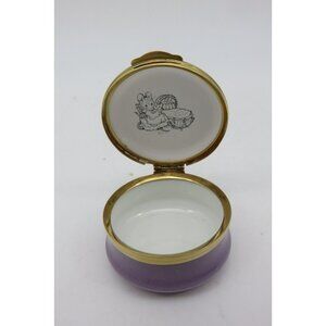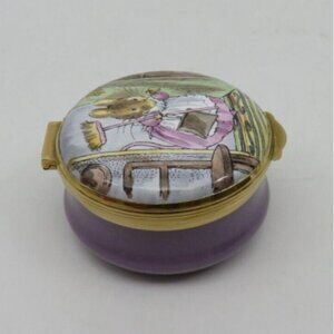 This enamel trinket box features a delightful portrayal of Hunca Munca holding a dustpan and broom.