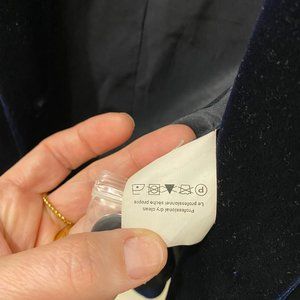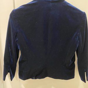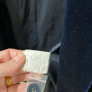 Cute, classic, velvet blazer in royal-navy colour. Has a vintage Victorian retro vibe. Super soft and shiny. Not sure about the brand - I bought at a Nordstrom sale years ago. It’s a small, cropped look. Cuffs mid arm.