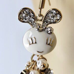 Gold tone Cat Earrings with a white enamelled face, large ears with encrusted rhinestones and dangling beneath it is a cluster of faux pearls and crystals