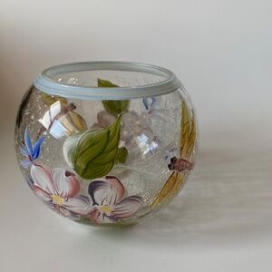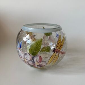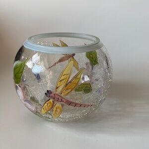 Crystal Clear Crackle Glass Dragonfly Crystal Votive Holder Hand-painted Vintage